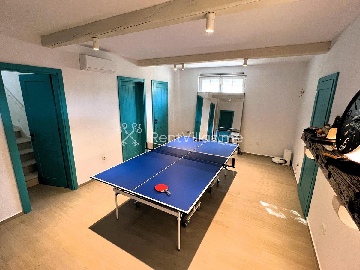 Downstairs, the villa surprises again with a home gym, table tennis zone, and a beautifully restored wine cellar that doubles as a cinema room or informal lounge. There’s even an extra bathroom here, giving the space flexibility for extra guests.
